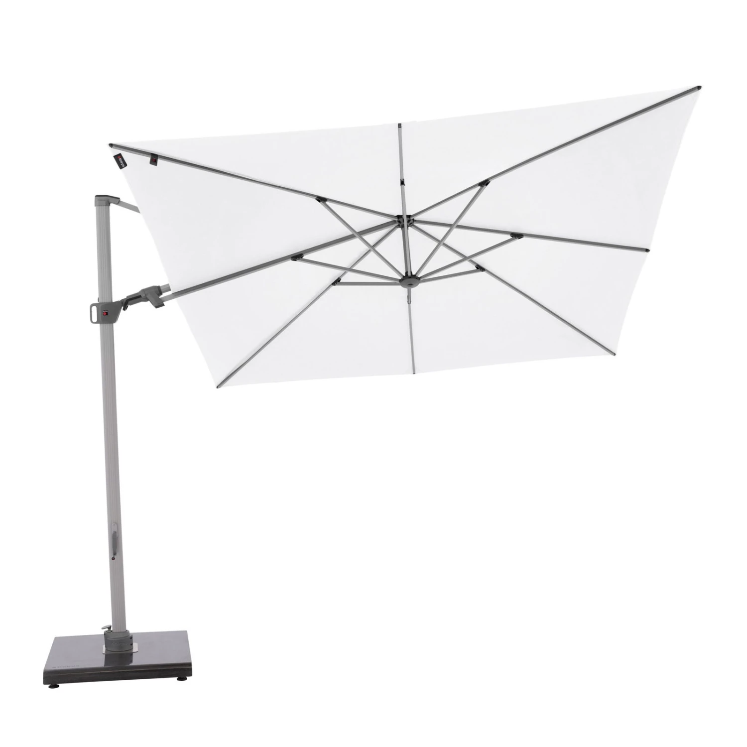 Mit dem quadratischen Pendelschirm von Knirps erstehen Sie den perfekten Sonnenschirm für Ihren Garten oder die Terrasse. Das Schirmdach misst ca. 275 x 275 cm und bietet so besonders viel Schatten. Dieser Schirm steht für die innovative Verbindung von Nützlichem mit Schönem: Ein schmückendes Design-Element, das Sie vor der Sonne schützt. Der wuchtige Mast aus witterungsbeständigen Aluminium in Grau und der massive Sockelfuß in dezenter Optik verleihen dem Sonnenschirm eine zeitlose Erscheinung. Der Ampelschirm lässt sich durch den Schiebegriff und die leichtgängige Kurbel einfach und ohne großen Kraftaufwand aufspannen. Aufgrund des Drehtellers mit Fußtaster ist der Sonnenschirm um 360° drehbar und lässt sich mühelos durch einfache Schrägstellung schwenken. Somit passen Sie das Schirmdach ganz einfach an den jeweiligen Sonnenstand an. Der Bezug besteht aus witterungsbeständigem Polyesterstoff, ist fleckschutzimprägniert, wasserabweisend, UV-beständig, abnehmbar und per Handwäsche waschbar.