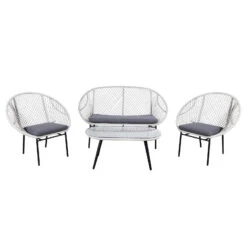 Diese 4-teilige Sitzmöbelgruppe besticht durch eine elegante, schwerelose Optik und bietet Ihnen zugleich einen hohen Sitzkomfort. Die Sitzgruppe Nairobi mit Kunststoffgeflecht wertet Ihr Einrichtungskonzept im Innen- oder Außenbereich durch eine trendige Note auf. Die Sitzgruppe ist witterungsbeständig, pflegeleicht und zugleich stabil gebaut.