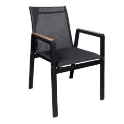 Der Stapelsessel in zeitlosem Look punktet mit einer durchdachten Materialkombination aus Alu und Textil. Die Armlehnen in Holzoptik verleihen dem Möbelstück einen schicken, rustikalen Akzent. Als Element einer Essgruppe oder als eine unkomplizierte Sitzgelegenheit im Garten macht dieser schwarze Stapelsessel eine gleich gute Figur.